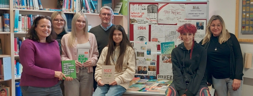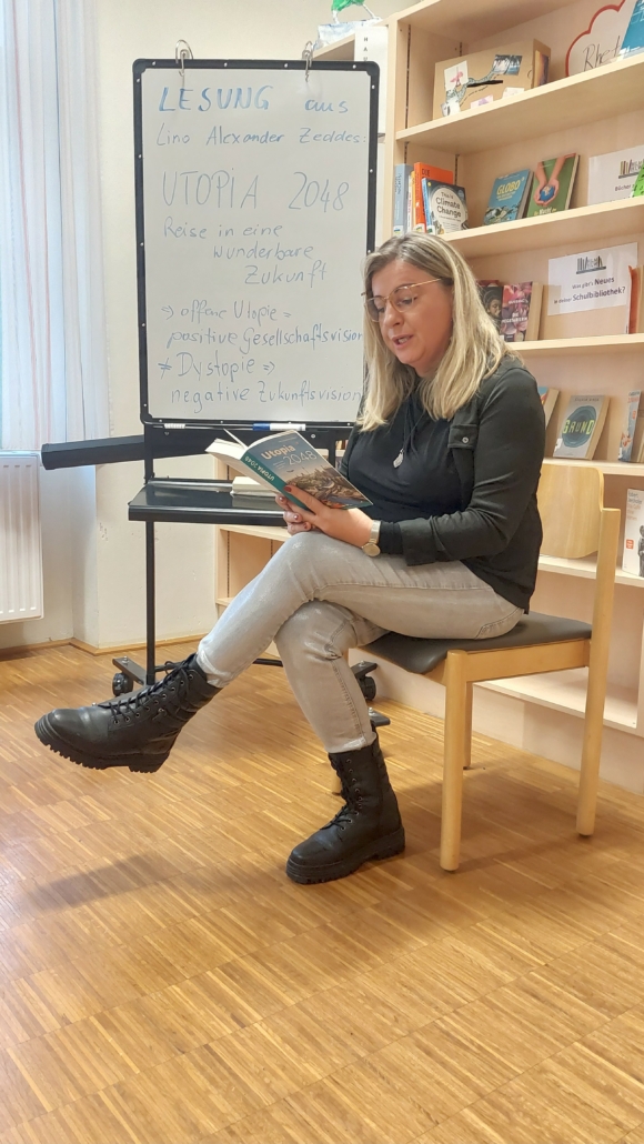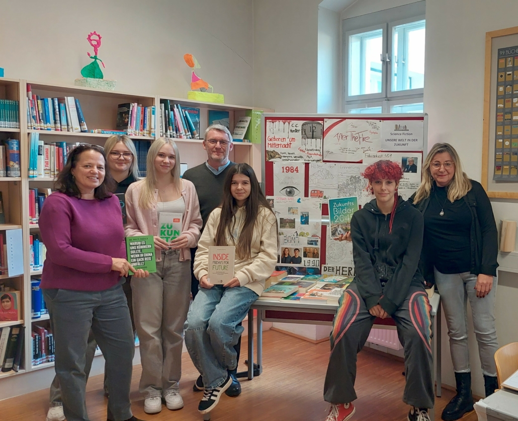 An verschiedenen Kreativstationen konnten die Schüler:innen ihrer Fantasie freien Lauf lassen und eigene Zukunftsbilder entwerfen. Ein Büchertisch lud zum Schmökern und Entdecken spannender Literatur rund um Utopie, Science Fiction und Nachhaltigkeit ein. Davor las Schulbibliothekarin Bernadette Gerstl zur Einstimmung aus einem Text, der zum Nachdenken über mögliche Lebenswelten von morgen anregte.