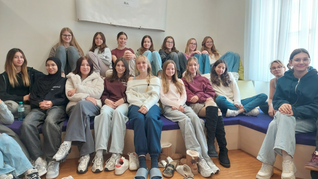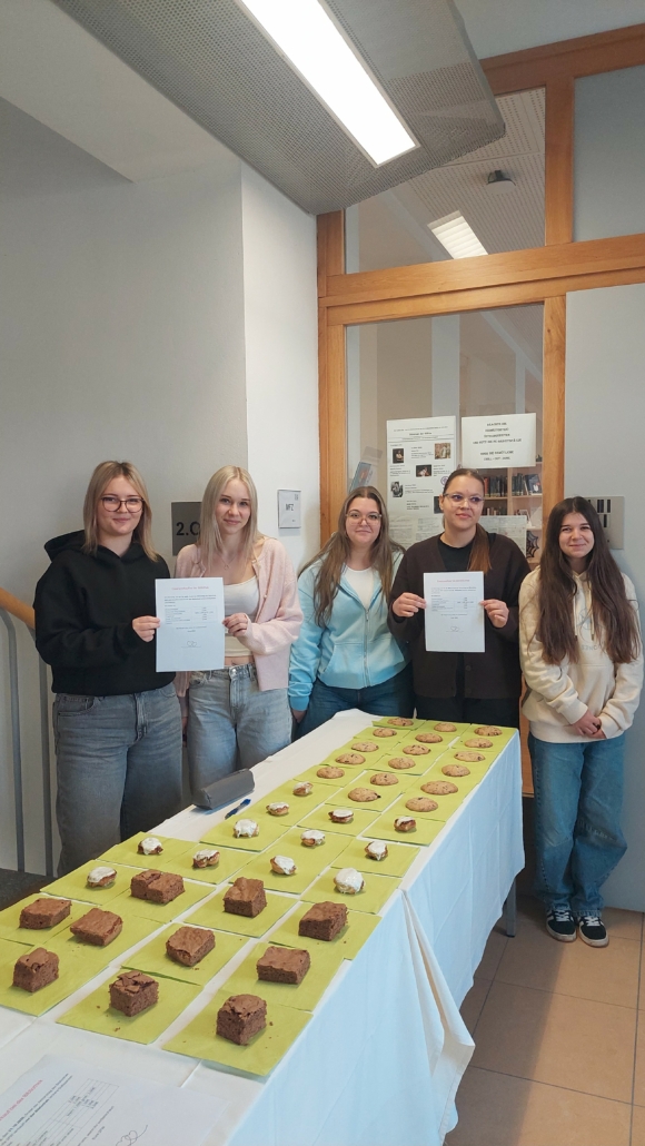 Foto 3: Pausenbuffet der 2FW vor der Schulbibliothek; v.l.n.r. Maya Kirchhofer, Elena Meisl, Alexia Stroescu, Elida Matesan, Denise Pfeiffer