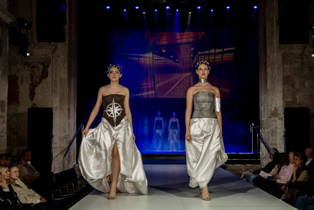 Der dritte Teil des Abends gehörte ganz der Mode. Nach einem eleganten Auftakt mit einer Akrobatik am Vertikaltuch von Amelie Beranek (2bhlm) präsentierten die Schüler:innen ihre Kollektionen. Zu sehen waren unter anderem Designs mit KI-generierten Textildrucken, monochrome Zukunftslooks sowie kreative Interpretationen klassischer Modeformen. Besonders auffällig war eine Kollektion in schwarz-rotem Karomuster mit roten Plastiksackerln und Lockenwicklern als Kopfschmuck, die eine Hommage an die britische Designerin Vivienne Westwood darstellte.