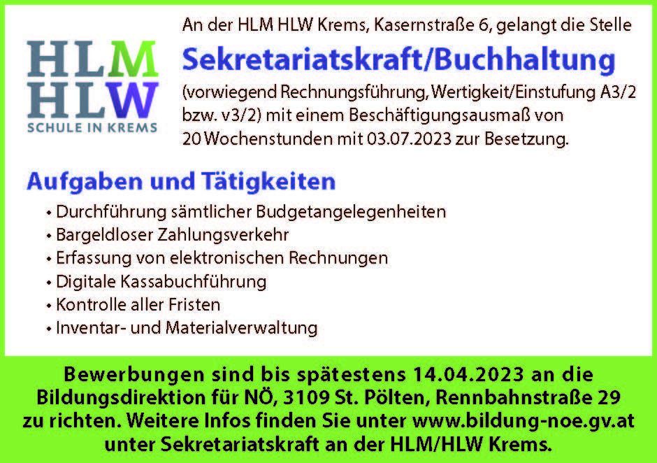 Im Bereich der HLM HLW Krems gelangen folgende Stellen zur „Ausschreibung“: Buchhalter*in für die Schule und Mitarbeiter*innen im Schulbuffet.